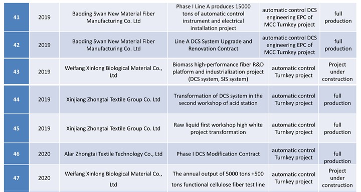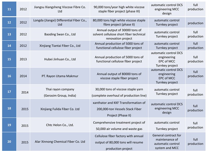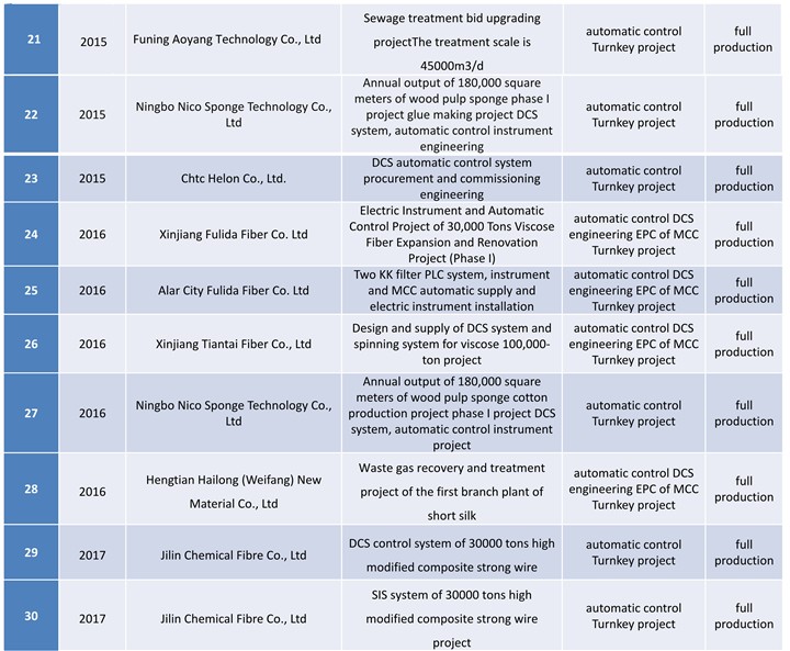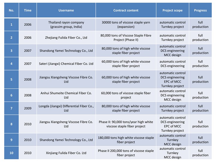 At the construction of domestic new viscose factory in nearly five years, Process control system for viscose staple fiber production of JTDC, main contractor of automatic control instrument, main contractor of MCC, installation, debugging and operation that are all got success one-time.so that the company has obtained the good market reputation, exceeded 50% market share in the domestic market that based on service for customer wholeheartedly, ensure the project stabl